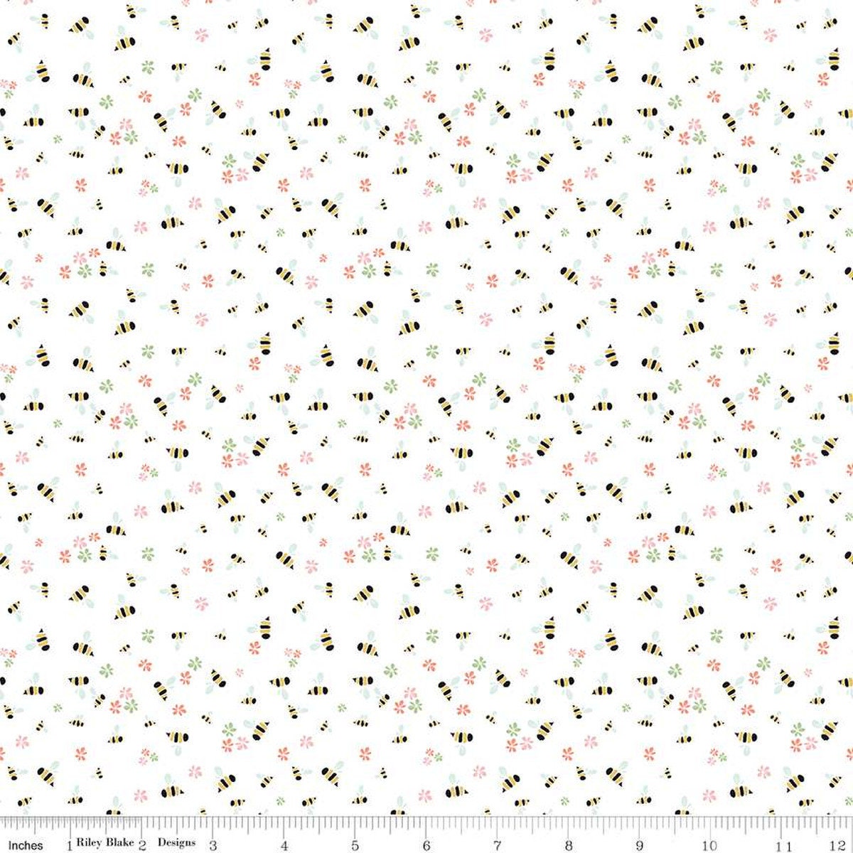 Clover Farm by Gracey Larson for Riley Blake Designs features 1/8" to 1/4" scattered bees and flowers on a white background.