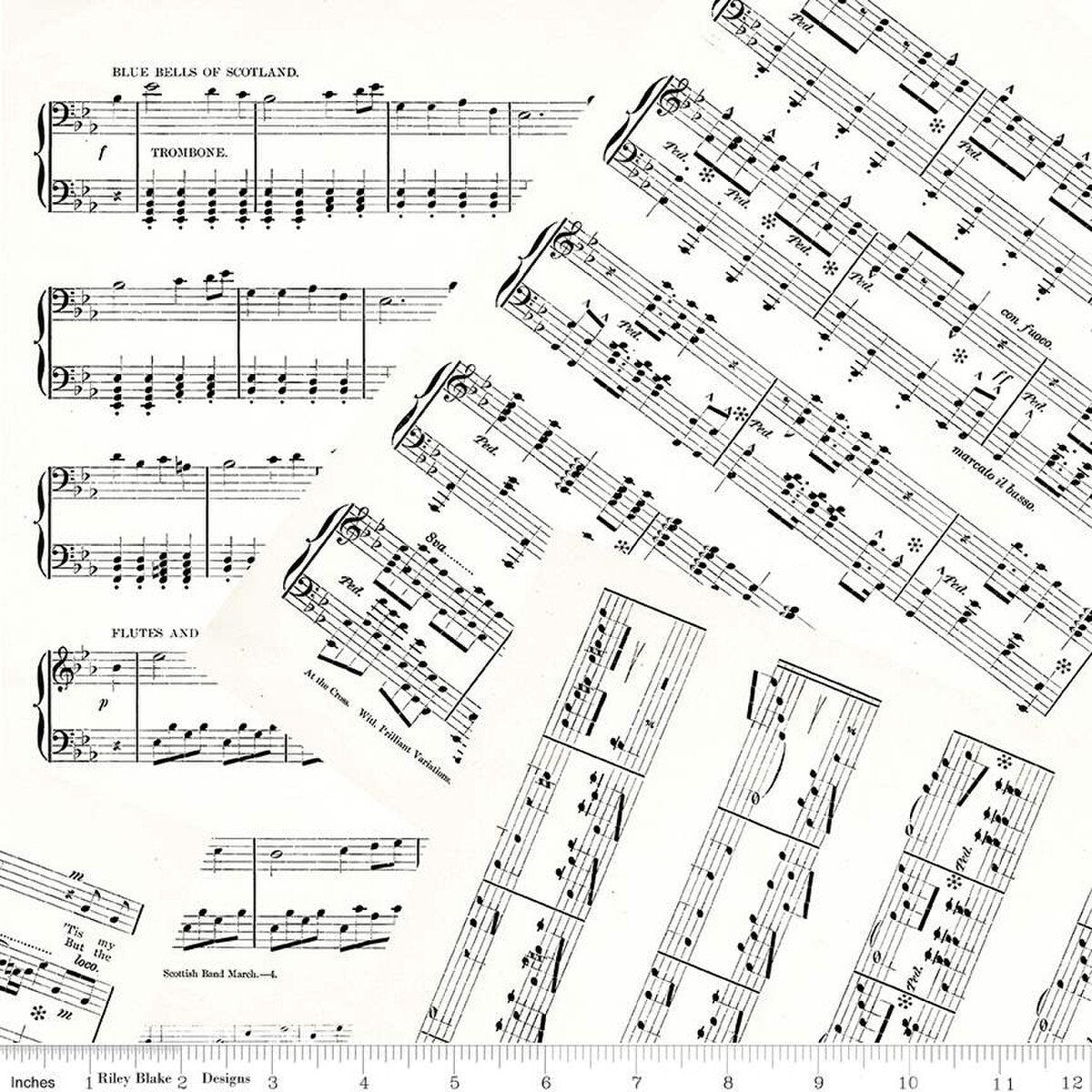 Journal Basics by J Wecker Frisch for Riley Blake Designs features scattered music scores pattern. Background is a pure white color.