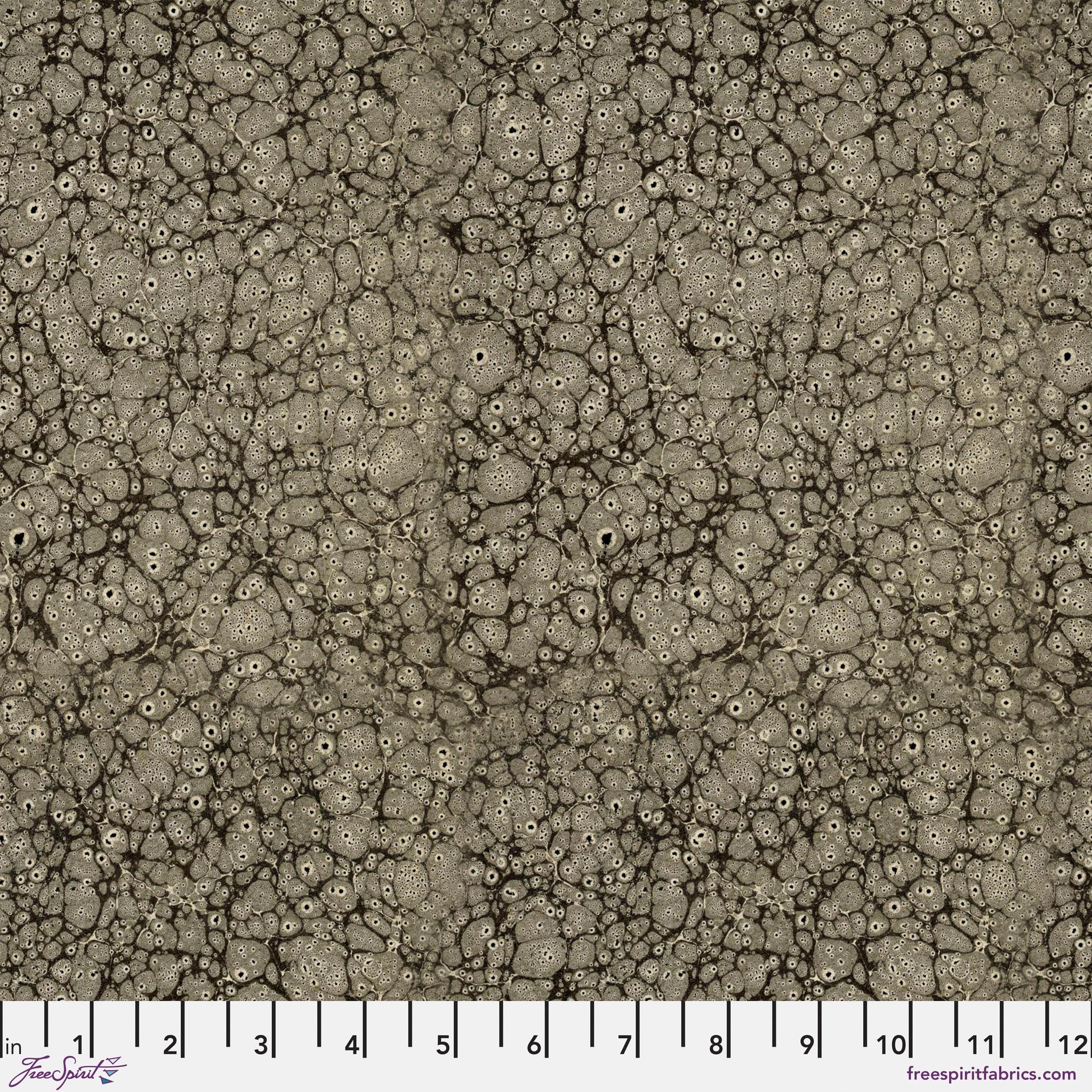 Laboratory Tapestry by Tim Holtz for Free Spirit Fabrics has features a grey composition print on a distressed black background.