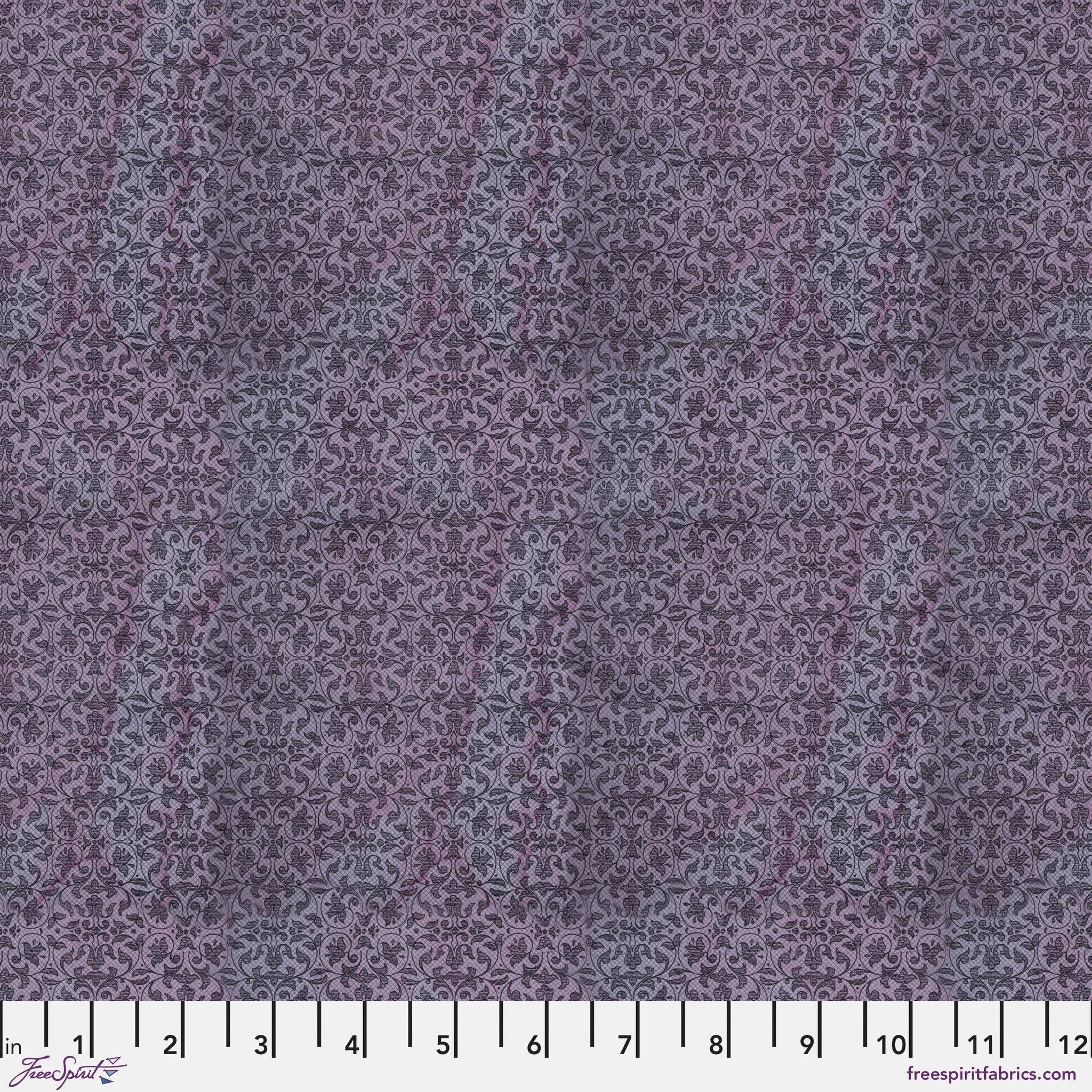 Laboratory Tapestry by Tim Holtz for Free Spirit Fabrics has features a wallpaper print on a distressed purple background.
