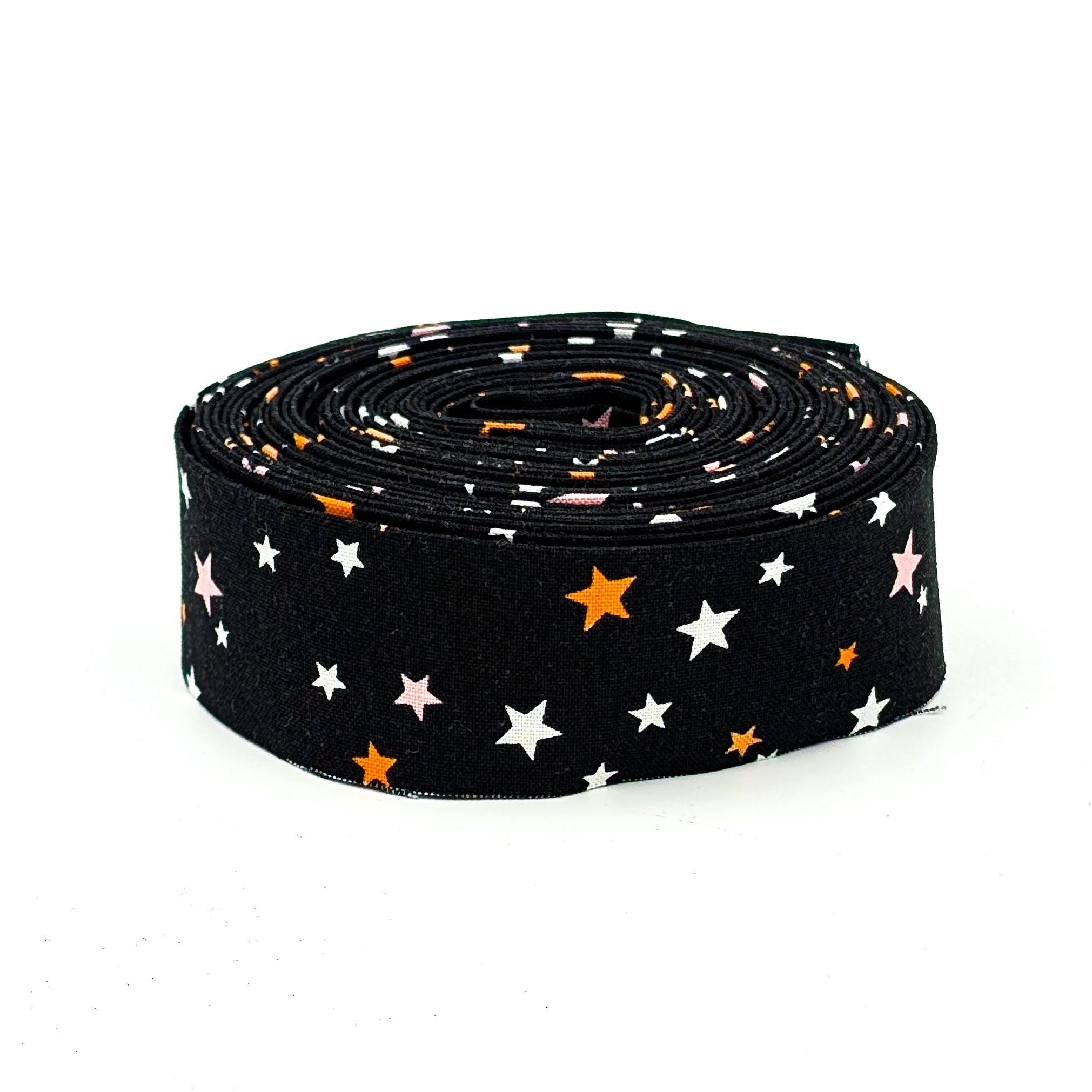 This item is 1 1/4'' inch quilt binding (2 1/2” strip folded in half) made from Hey Pumpkin by My Mind's Eye for Riley Blake Designs and features scattered orange, pink and white stars on a black background.