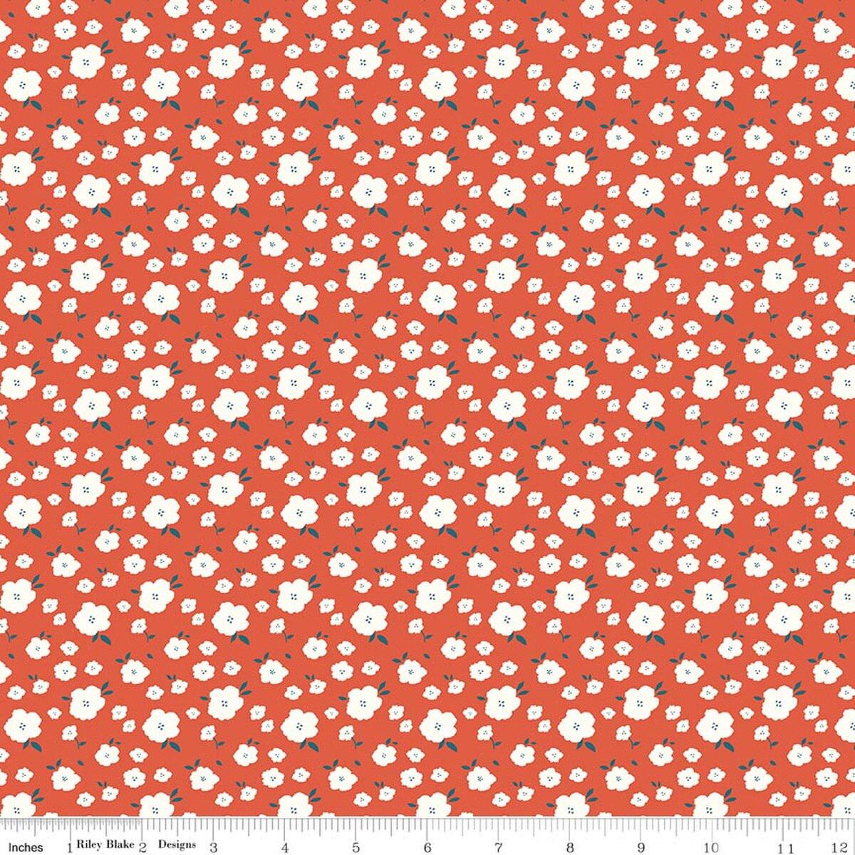 Serendipity 2 by Minki Kim for Riley Blake Designs features scattered ivory blossoms on a deep red/orange background.