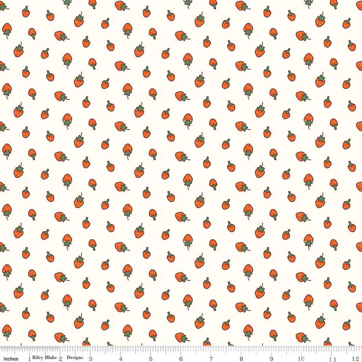 Serendipity 2 by Minki Kim for Riley Blake Designs features 1/2" red strawberries on a cream background.