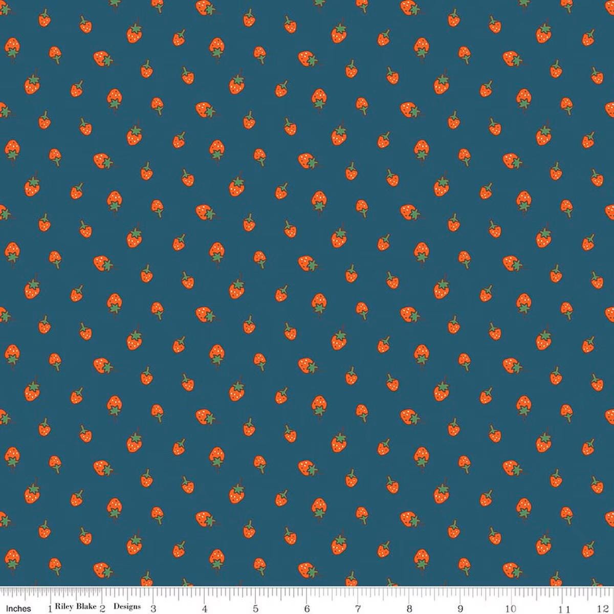 Serendipity 2 by Minki Kim for Riley Blake Designs features 1/2" strawberries on a deep blue background.
