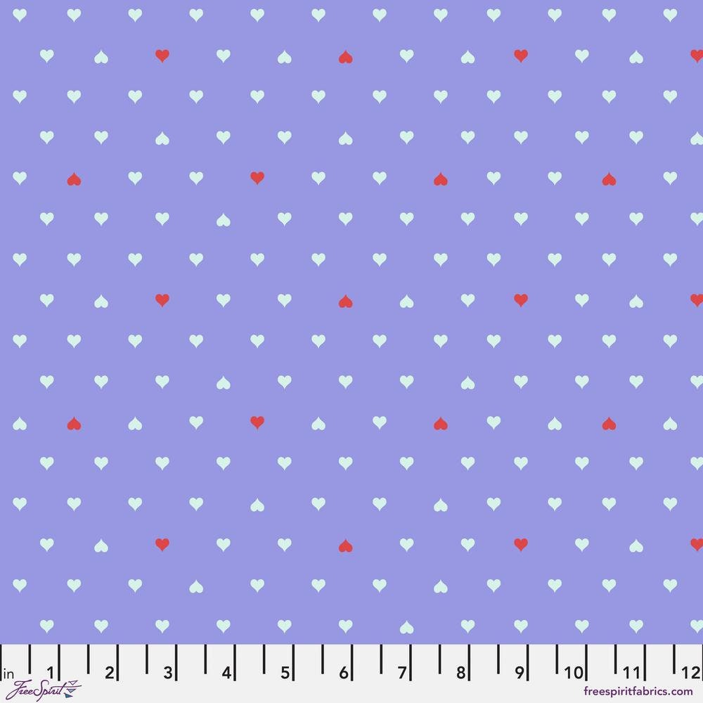 This quilt binding is 1 1/4'' inch quilt binding (2 1/2” strip folded in half) made by Tula Pink for Free Spirit Fabrics. The aqua and red hearts are 1/4'' wide on a periwinkle blue background.