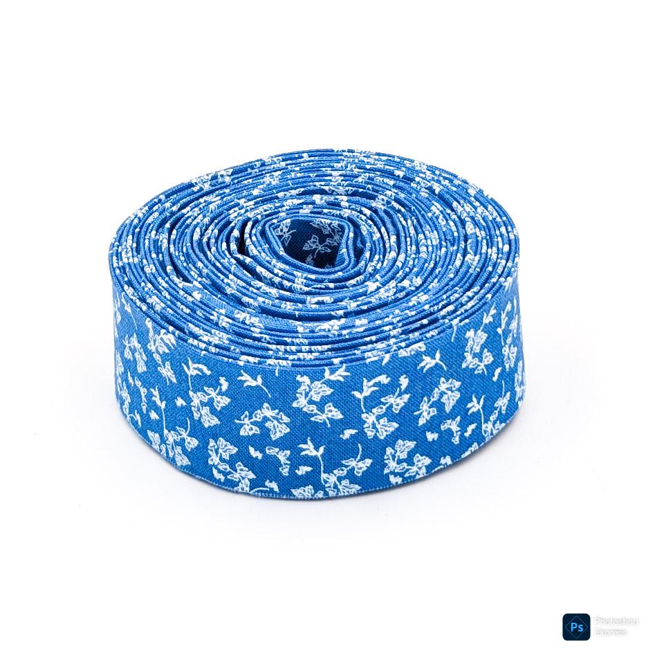 This item is 1 1/4'' quilt binding (2 1/2” strip folded in half) made from Penelope by My Mind's Eye for Riley Blake Designs. This print features scattered medium blue flower sprigs on a background of creamy white.