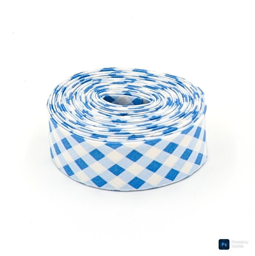 This item is 1 1/4'' quilt binding (2 1/2” strip folded in half) made from Penelope by My Mind's Eye for Riley Blake Designs and features a 1/4" printed gingham check in a medium blue and creamy white.
