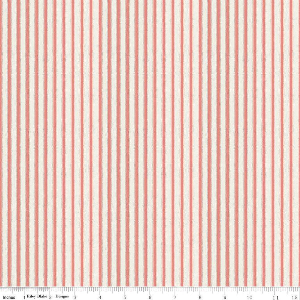 Ivy Reese by Deena Rutter for Riley Blake Designs features a ticking stripe of coral blush and white. The vertical stripes are approximately 1/8'' wide.