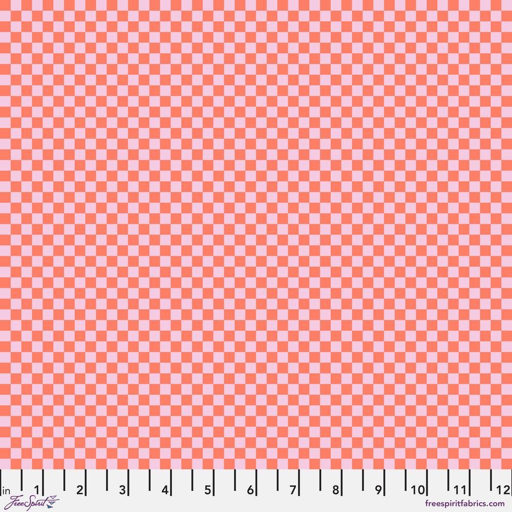 Tula Pink Check Please is from the Untamed collection. The geometric design is made up of alternating 1/4" NEON Orange and Lavender Purple checks. The NEON part is a little stiffer than the lavendar part because of the NEON ink used.